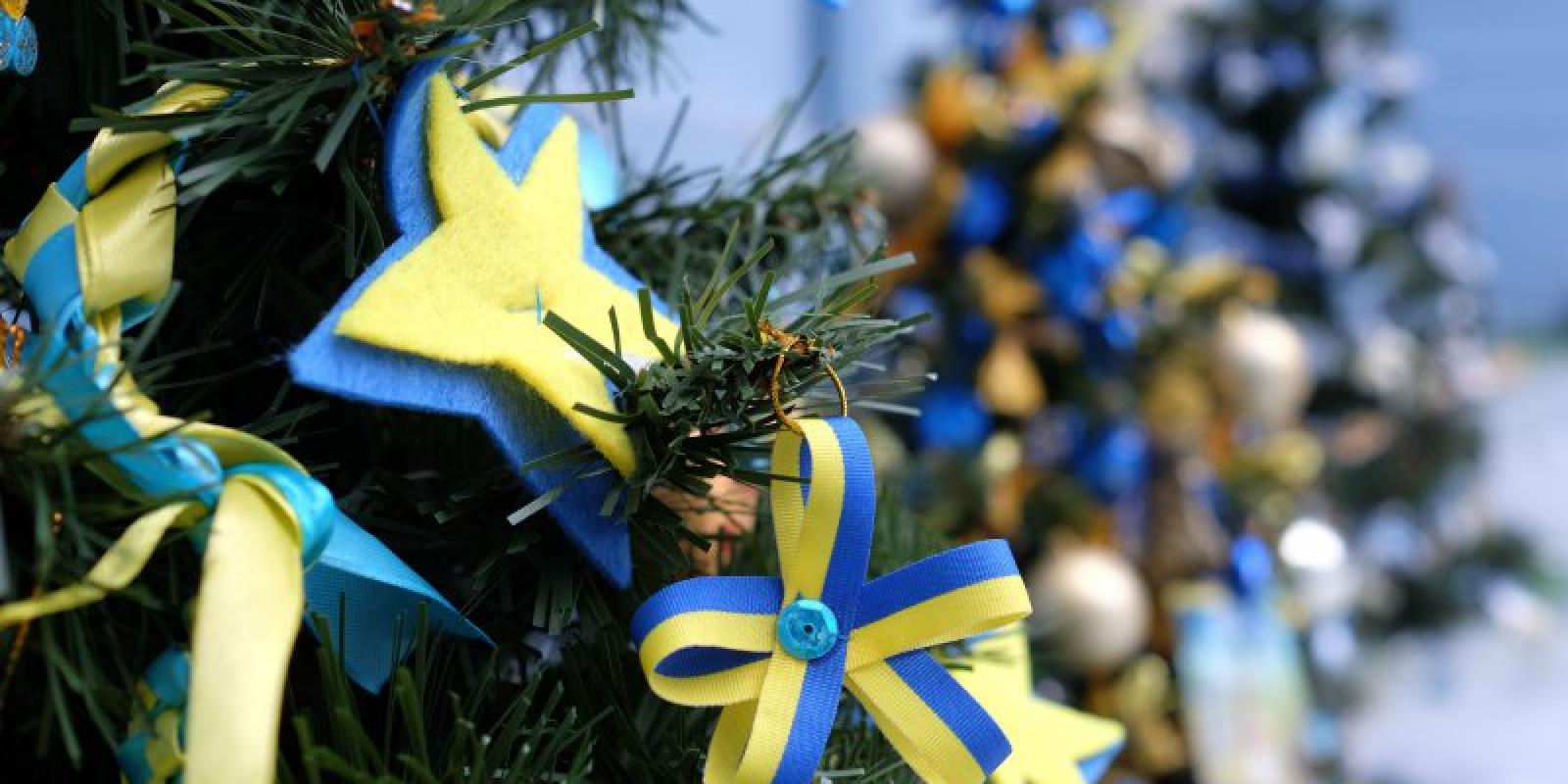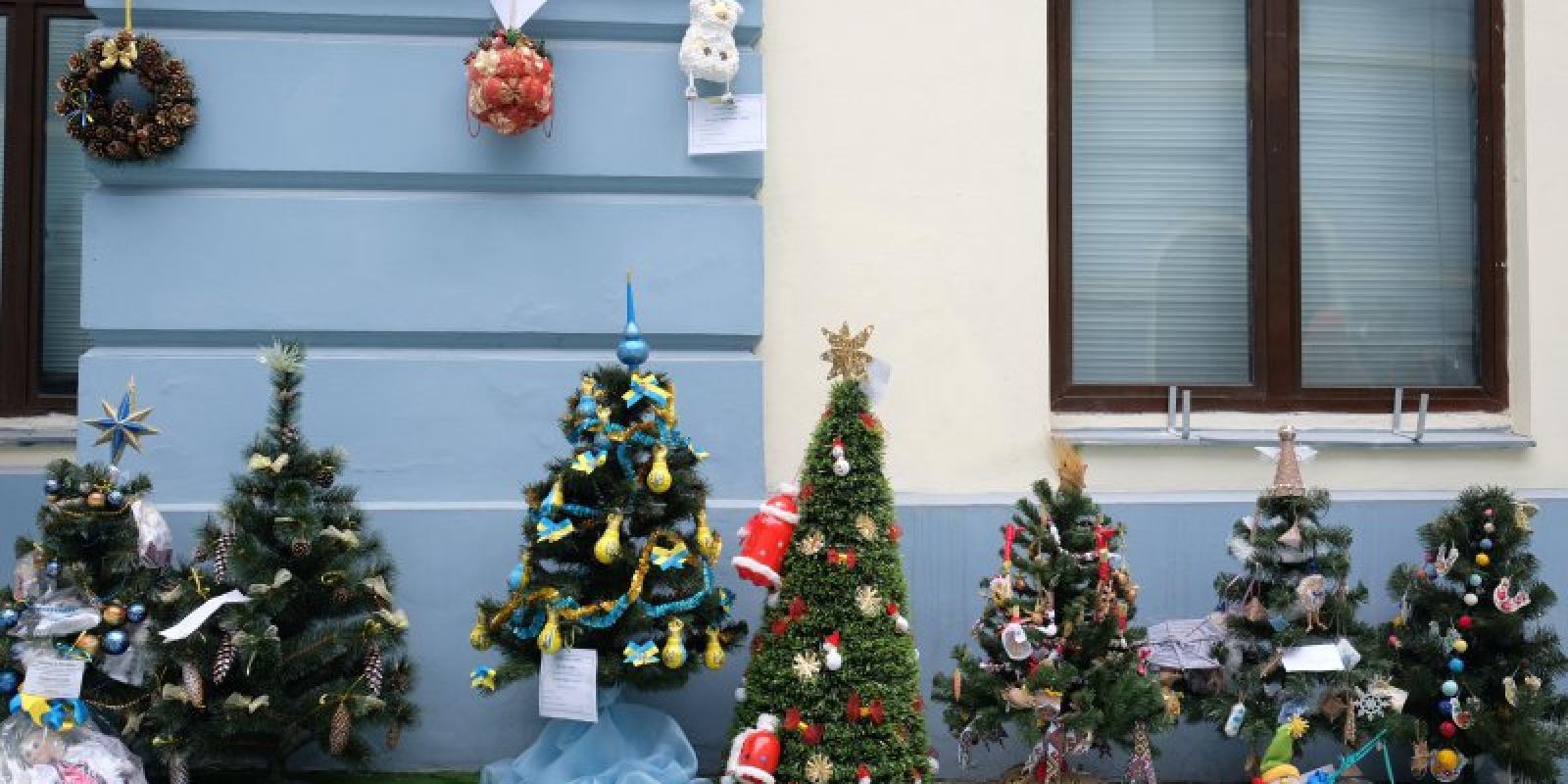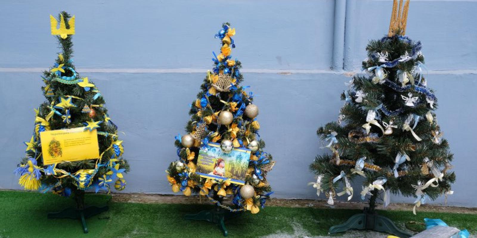 Більшість ялинок — у патріотичних кольорах. На одній з ялинок — іграшки, зроблені з лампочок, що розписані блакитними тризубами на жовтому тлі.