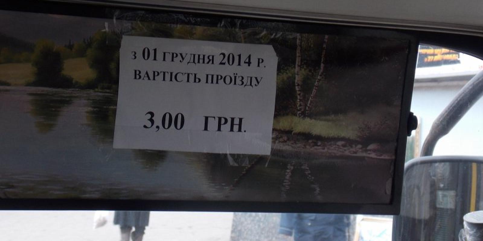 У салонах автобусів — таблички з надписом "Проїзд коштує три гривні".
